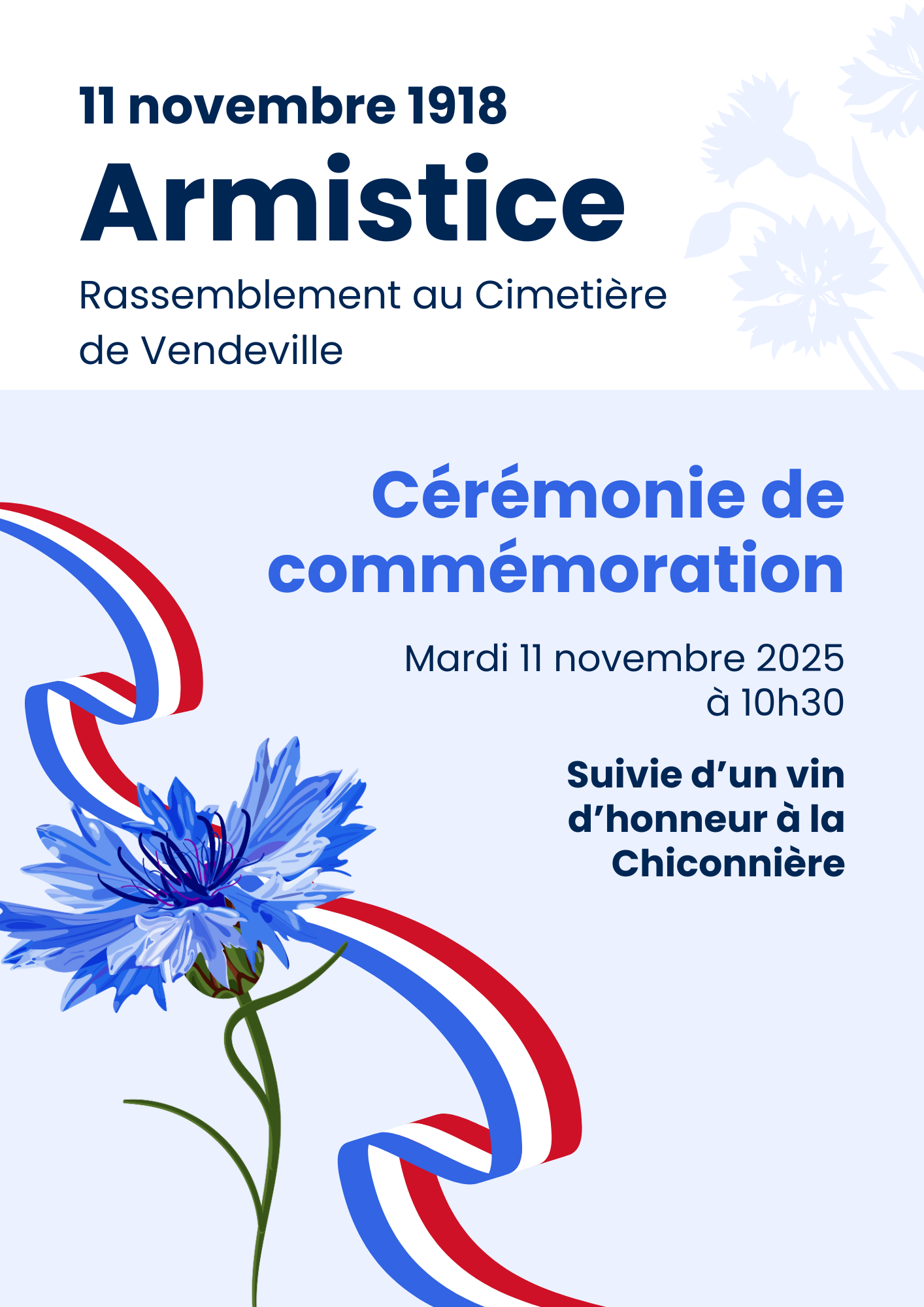 Vous êtes conviés le mardi 11 novembre 2025 à 10h30, à la Commémoration de la signature de l’armistice du 11 novembre 1918 qui se déroulera au cimetière.
