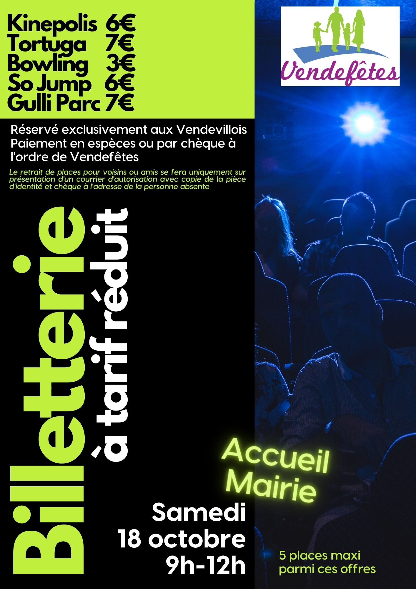 Comme tous les ans avant les vacances de la Toussaint, l'association Vendefêtes vous permet de profiter de tarifs avantageux pour l'achat de vos places de cinéma, karting ou parc de jeux.