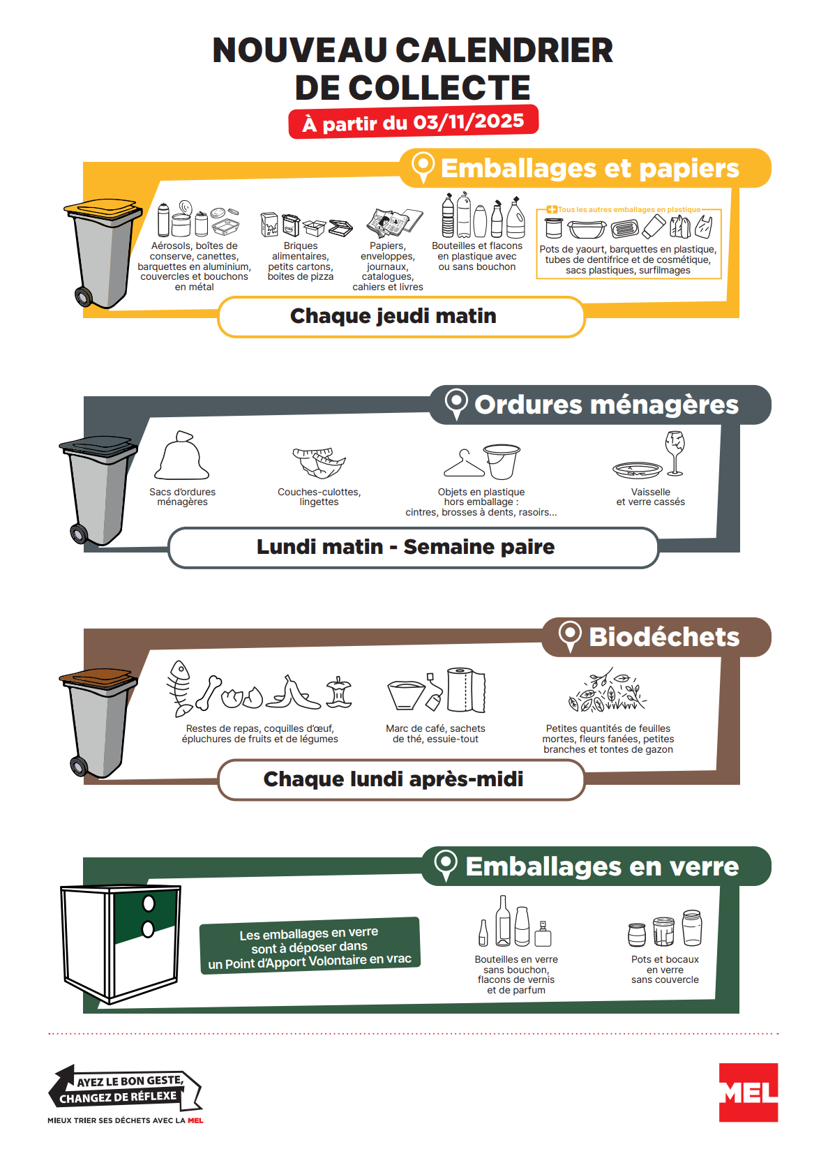 Jeter moins, trier plus et mieux, c'est possible ! Réduire de 15% le poids de nos poubelles et recycler les 2/3 des déchets collectés à l'horizon 2030 sont les deux principaux objectifs du schéma directeur des déchets ménagers et assimilés adopté en 2021 par les élus du Conseil métropolitain. D'ici 2024, le territoire métropolitain adoptera de nouvelles pratiques de tri. Ayez le bon geste, changez de réflexe, la MEL vous accompagne !