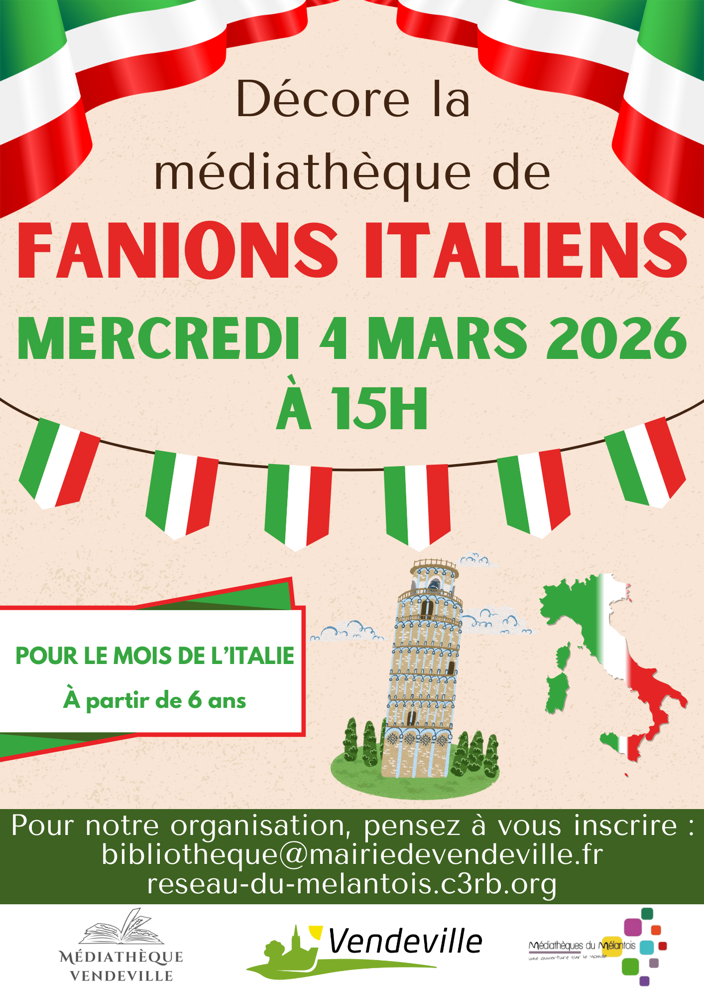Dans le cadre du Mois de l’Italie, la médiathèque de Vendeville invite petits et grands à participer à un atelier créatif pour fabriquer des fanions italiens afin d'embellir la médiathèque aux couleurs vert, blanc et rouge !